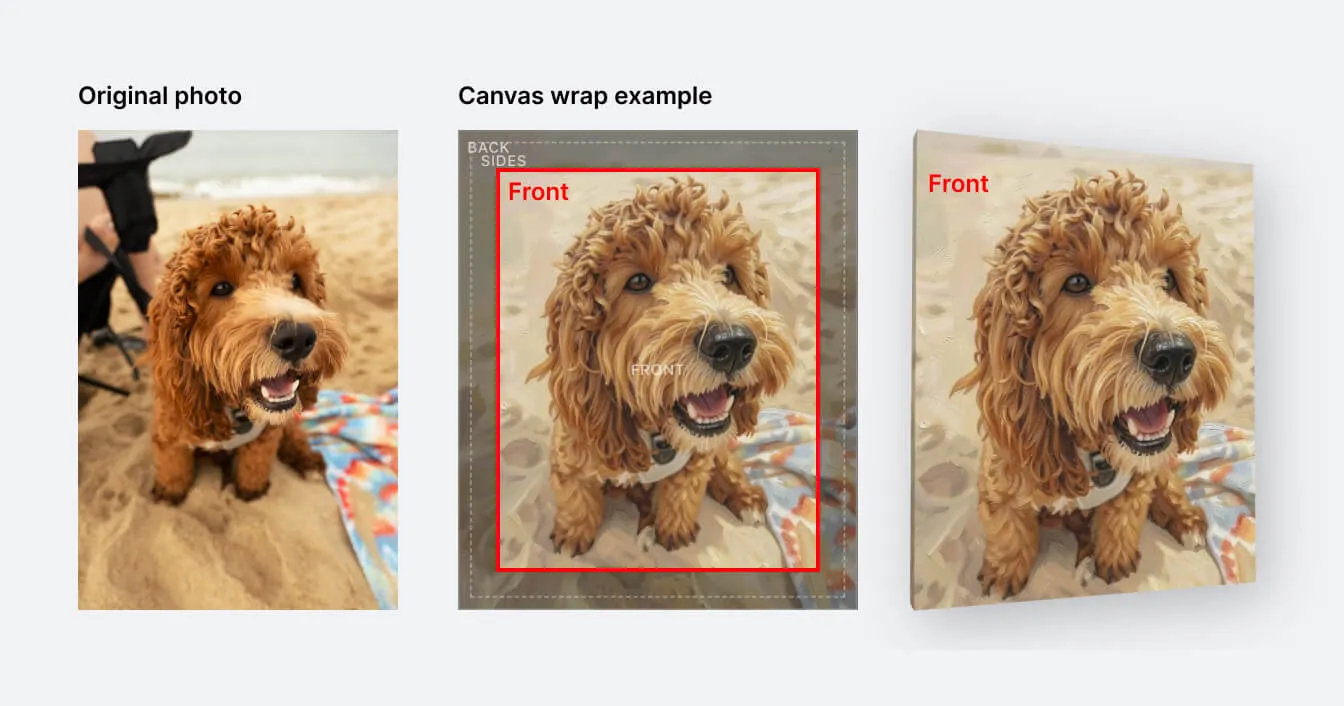 Because the sides need extra image material to wrap around the frame, the visible front area is slightly smaller than the full printed image. Your image is automatically cropped to fill the canvas — the center of the image is shown on the front, and the edges wrap around the sides.